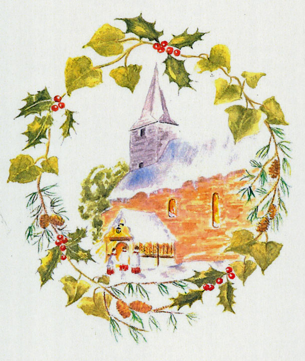 This year, we have two designs. One is an original illustration by Lin Henning, and features our church building encircled by a wreath of holly and ivy. The other is a photograph of a design knitted by Brenda Dearing, featuring reindeer pulling Santa's sleigh through the sky.