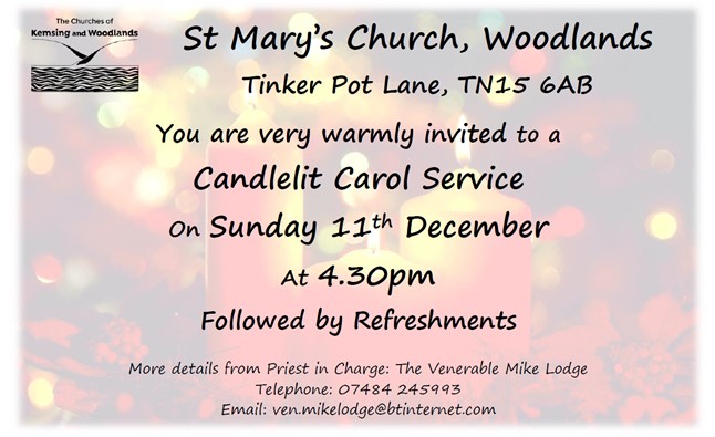 Candlelit Carol Service - Sunday 11th December at 4.30pm St Mary’s Church, Tinker Pot Lane, Woodlands